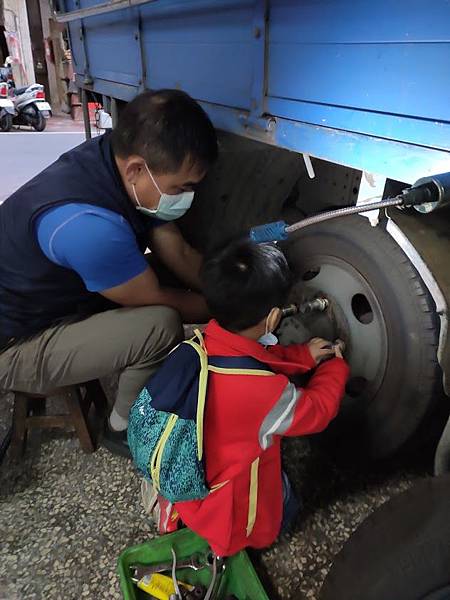 燁當起了小幫手,轉動輪胎的大螺絲,